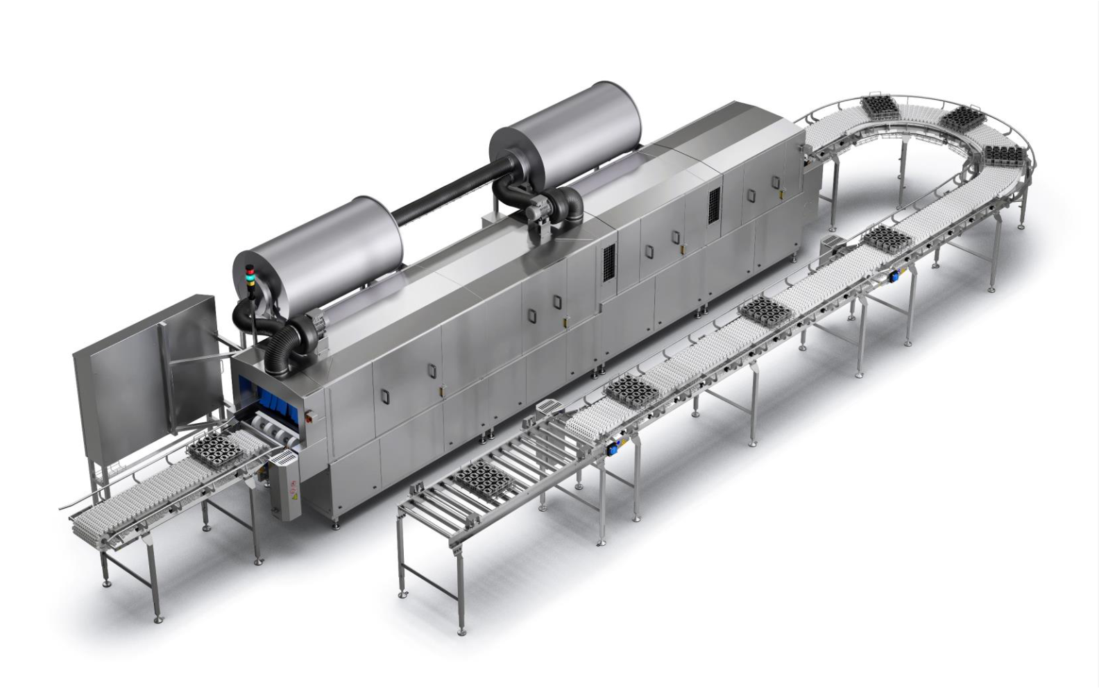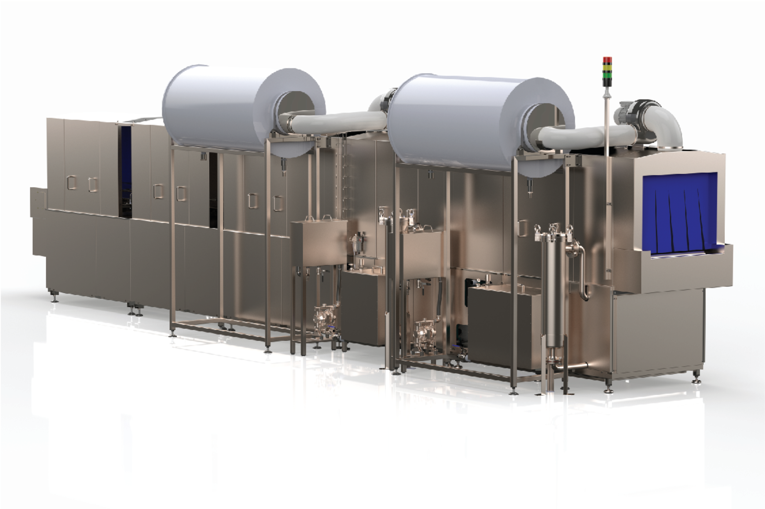 In the blow-off zones, the washed crates and molds are blown dry with a combination of 5 fans,